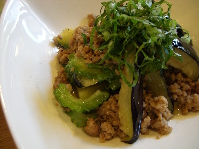 本日のランチは「茄子とゴーヤーの挽肉のせ、サラダ、酢の物、