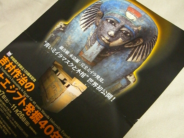 『吉村作治の早大エジプト発掘40年展』 伊勢丹内の美術館でやっていて 以前から気になっていたので、 せっかく来たので行かなきゃです☆ 平日の夕方前というのに結構な人が来ていました(^^;) エジプト展は昔から好きで関西に来た時には けっこう行ってます。 今回の発掘品、日本での公開は最初で最後らしいです。 アヌビス神やホルス神。 あの姿いいですね~(惚れ) あと今回メインの青いミイラマスクはホント綺麗でしたよ☆ 公開終了まであと僅かですが(26日迄)もし行かれるなら 混雑避けてオープン直後がオススメではないでしょうか(^_^)