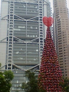先週、母親と姉っちの居る香港へ行ってきました。 香港の町はクリスマス前ということでいたる所に クリスマスの飾付けがされてました。 こんな風に巨大なツリーもあります。 ハートモチーフで、なかなか可愛い☆